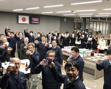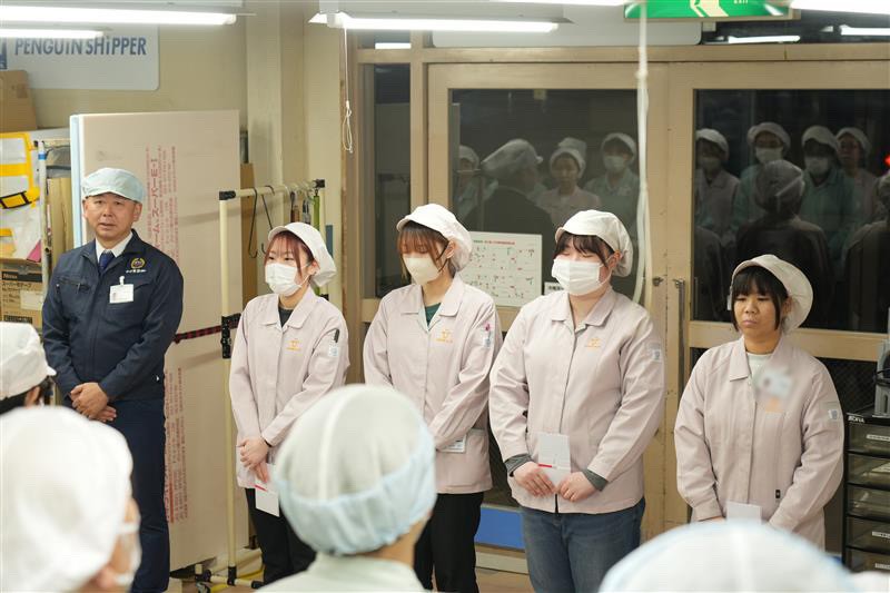 本日の全体朝礼時に、会社から成人祝を贈呈し、新成人一人ひとりから成人としての心強い抱負が述べられました。