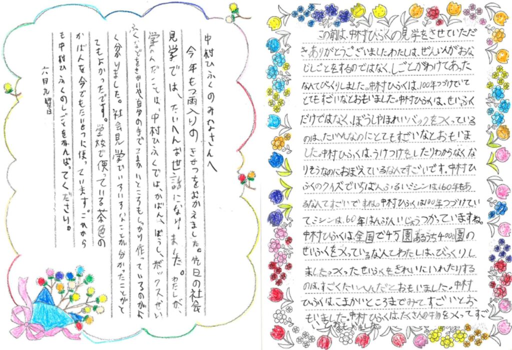 先日、社会見学に訪れた小学3年生の皆さんから、心温まるお礼の手紙をいただきました。見学を