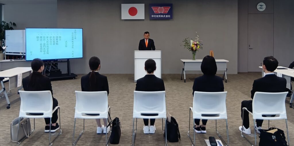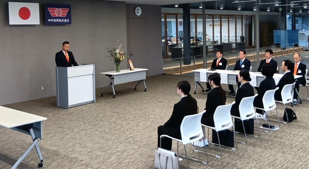 入社式では、代表取締役より会社の歴史やものづくりへの想い、そして「良い仕事は良い人によって生まれる」というメッセージが伝えられ、新入社員へ期待と激励の言葉が贈られました。